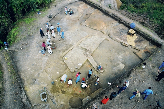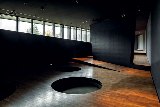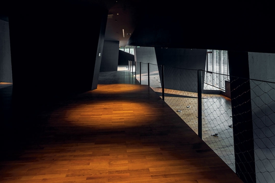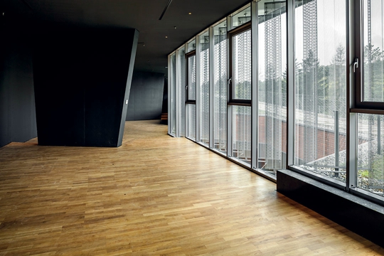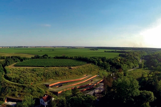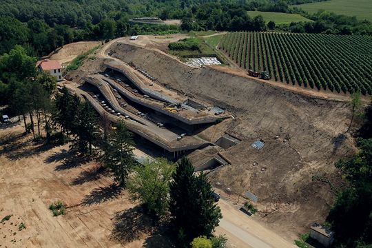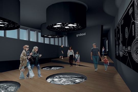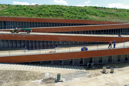 The interior gives the impression of a Neolithic cave, dug under the hill, warm and safe but semi-dark and rough to the touch which, in the interpretation of the author, is emphasized by anthracite black rustic concrete of the inner walls. The impression is somewhat spoiled by the too artificial parquet floor, which could be replaced by an equally dark raw concrete glaze, as a better and cheaper solution more suitable for the ambience. The path through the interior of the museum is one-way; the zigzag communication follows mild ramps in a constant upward movement and the theme sequences of the future collection are dilated by transverse wall partitions. The crescendo of moving through this inner serpentine culminates in the highest final point of the collection, from where it is possible to continue the tour on the outdoor roof promenade ascending to the archaeological plateau of the future archaeological park. This interweaving of the interior and the exterior has resulted in a really impressive counterpoint of millennia, with geometric terraces of the 21st century positioned next to a 7000-year-old site with the traces of dugouts. We are still to see the finalisation of the interior of this interesting museum, hopefully before it is completely covered by the neglected environment and thick underbrush.