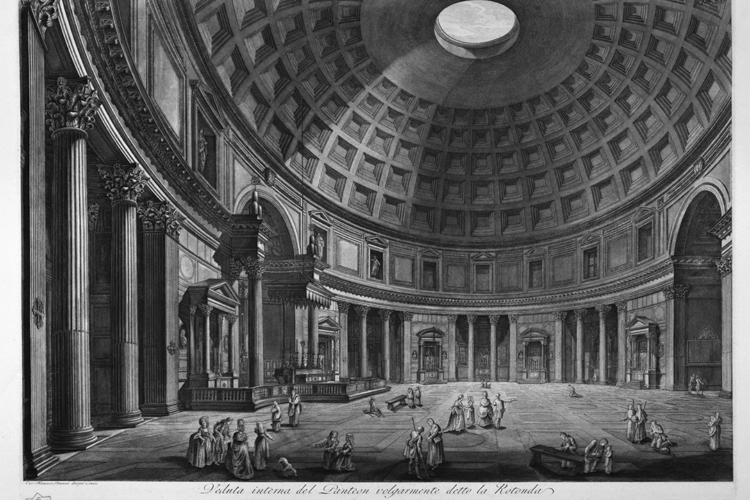 The Roman Pantheon2 is the example par excellence. Well built, and a perfect embodiment of the universal function endowed to it by its creator, the Pantheon is also overwhelmingly beautiful. All of the great creators have understood that when they’ve been inside of it. Suffice it to quote Henry James when he recounts the memorable scene of Count Valerii kneeling inside the Pantheon with only moonlight and with rainwater making the light from on high material.
