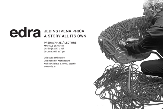 Jedan od vodećih ljudi EDRE, Michele Serafini, u utorak 20. lipnja 2017. u 19 sati u Oris Kući arhitekture održat će predavanje pod nazivom EDRA i razvoj dizajnerskog namještaja od početne ideje do njegove primjene u suvremenom interijeru.
