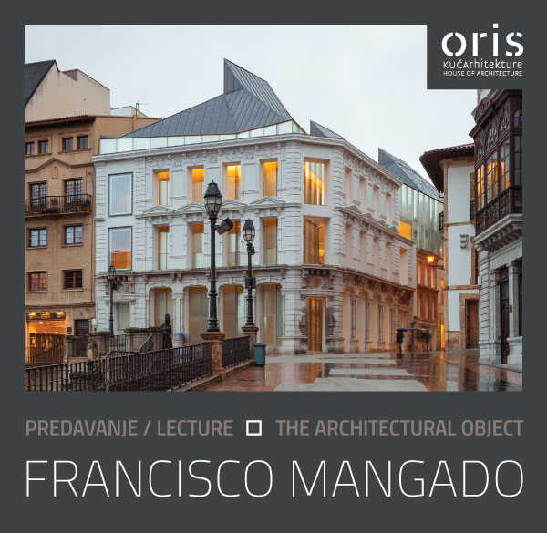 [Oris Kuća arhitekture] Predavanje Francisca Mangada - The Architectural Object Početna stranica/Newsletter 15/02/2016 U srijedu, 17. veljače 2016. U 19 sati u Oris Kući arhitekture istaknuti španjolski arhitekti Francisco Mangado održat će predavanje naslova The Architectural Object. MODERATOR: Tadej Glažar VIŠE Ulaz je slobodan. Svi posjetitelji predavanjadobit će bon za 20% popusta u restoranu Voncimer koji mogu iskoristiti 17. 2. 2016.