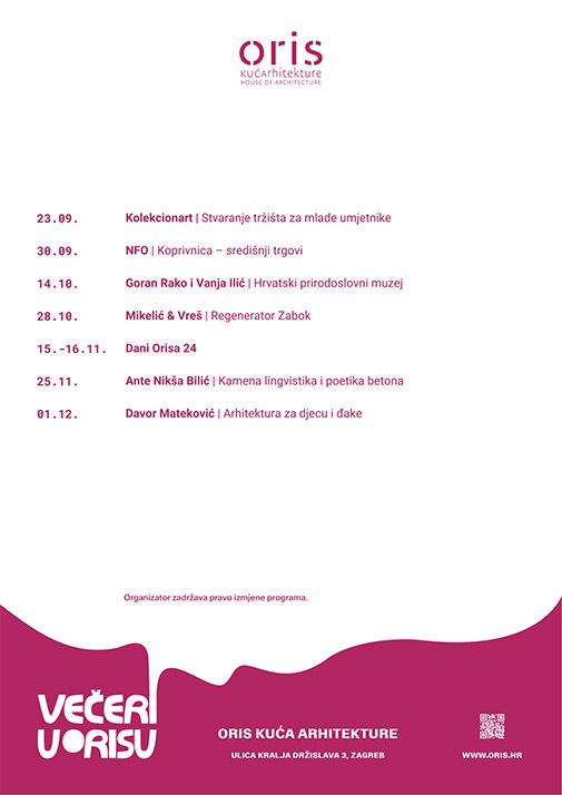 “Evenings in Oris” is a series of panel discussions, talks and lectures held by architects and authors from other fields of creativity - scientists, artists, writers, musicians and others. The series takes place every second Monday in the Oris House of Architecture gallery in Zagreb. With this project, Oris House of Architecture wants to provide all generations with the opportunity for cultural, productive and creative socializing, which we sometimes truly lack. At “Evenings in Oris”, interesting lectures are accompanied by the audience's involvement in discussions and socializing in a pleasant atmosphere usually with a glass of wine.