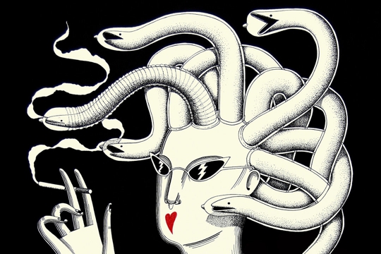 The exhibition Dramatic mythologies consists of the two series of illustrations which are still being developed simultaneously. The name originated as the combination of two cycles which are not connected, other than by the size of the format and the technique. Mostly all the works are ink drawings, with small segments of colour inserted in certain parts of the painting. The dimensions of the paper are 70 x 50 cm and the works have been created throughout the year 2015. When I was studying ancient architecture, I came across an extremely short version of the complete Greek mythology. A completely useless and absurd article drew my attention and made me laugh. It was about the declination of Zeus’s name in old Greek and it was longer than important mythological stories. After such revelations in the book, I threw myself into the myths, stories and scenes worthy of the Monty Python group. I wanted to illustrate stories, not the original ones, but their versions set in the modern time.