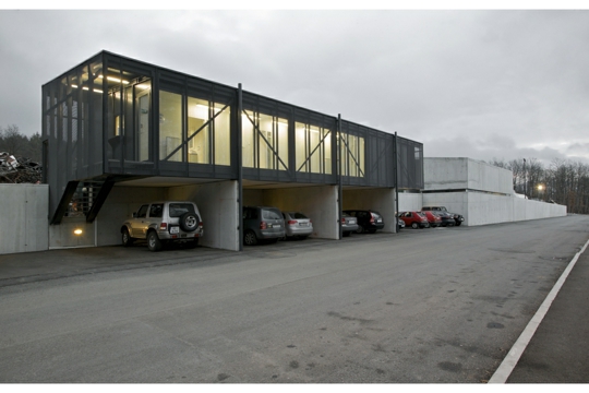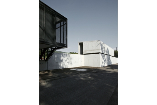 This architectural story, with the above-mentioned wall, includes two buildings, indeed modest in terms of dimensions, yet very rich in terms of narrative. The difference between the two is most obvious in relation to the used materials and expression – here it is concrete and tectonics, there it is metal and lightness. Two pavilions, identical in volume, that belong to this kind of architecture, in the form of a ‘house’, exist in the usual concepts. The first pavilion is intended for the complex’s ‘dirty’ functions (workshops, changing - rooms…) and the other for ‘cleaner’ segments (management, administration…). However, the main poetics of this architectural concept is not to be found in the elementary expression of rough functions bounded by concrete, nor of more refined ones that are embraced by a metal grid (as a simultaneous association with activities within the complex). The architects have achieved the highest degree of poetics by setting the pavilions on the already described wall in the landscape. The first pavilion, made of concrete, clings firmly to the processing yard and is separated from the vertical of the wall by a decent horizontal line which, at the same time, represents a band of light which during the daytime illuminates the interior space. The second pavilion, made of metal, on the contrary hovers above the recessed line of the wall, thus emphasizing its lightness, different construction and conscious lack of becoming one with the brutalised ambience of the complex.