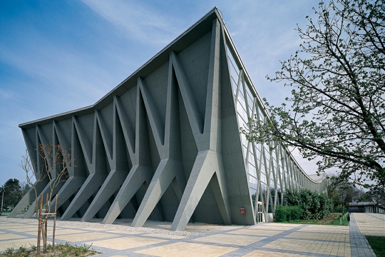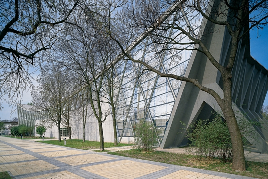 It is overgrown by greenery on one side, locker rooms have been added on the other side, it has been turned into a skating ring in the inside and hanging fabric curtains cover glazed walls. It looks like a boat off-course, anchored in order to be used while the Culture Centre is being built. But if we switch on a mental photo-shop and retouch the years when the decks were used for making hay a powerful Titanic appears just before its first sail.
