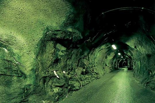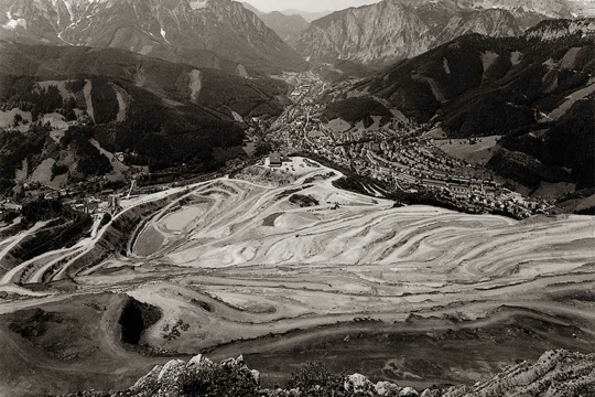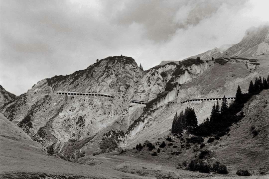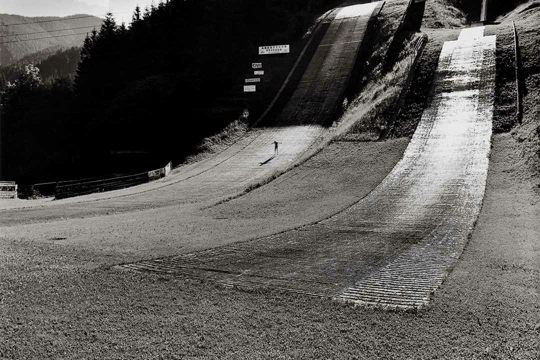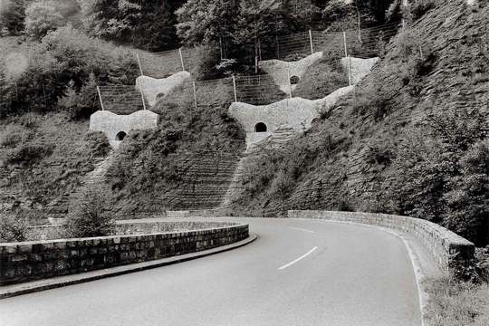 A hillock above the lake. Over its rim protrudes an edifice the shape of a ship’s bow, whose rim is turned to face the sky to become one with the outline of another hill in the background: the fractal infinity of the slope line brought to the finite measure. There where the hill is repeated, in a not so big neighbouring peak, squats a circular segment in the bow as / on the roof: breaking and thickening. The constructed and foreign body raises itself pathetically from the ambience of the eruptive natural bodies, competes with them and plays with their lines, parallels and with vectors invisibly engraved into the landscape.