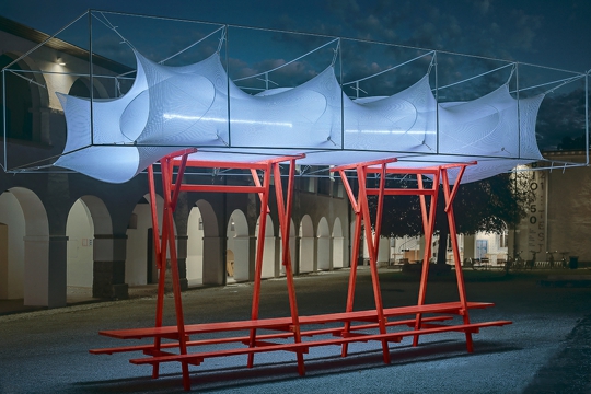 The construction of the wooden table is recognizable as familiar to those in picnic areas or used for garden parties. This archetypal form is enlarged for the needs of the Take a Seat! project; above it there is a canopy providing shadow or serving as a source of light. In the design process, the author obviously followed the principle of attaching an existing industrial or artistic product, i.e. one fragment of it, to the wooden construction.