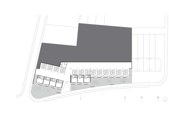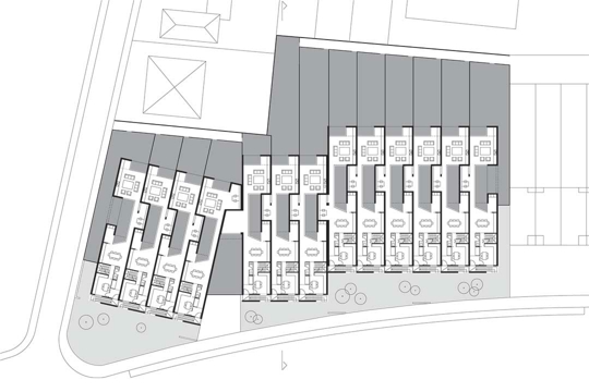 During an informal conversation on the construction site, one of the architects explained: We had some sort of initial intuition: since the very beginning, our intention was to have a shared garage, hidden from the street, because we wanted the houses to have inner patios, an intimate space for a person to retreat; nevertheless, we primarily knew very well from the very beginning – though perhaps this is not a correct thing to say – what we did not want it to look like.