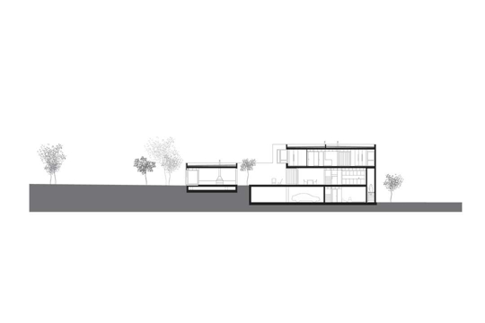 The section confirms the strength of such a decision. On the side facing the street, the building emerges as one volume on three levels, including most of its programme (kitchen, bedrooms, and bathroom). On the side facing the garden, it is, on the contrary, reduced to the living room which extends deeply into the plot, transformed into a little pavilion. The trees in the garden are well integrated in the architecture: there is an impression that the house is actually a pavilion in a garden. It is sufficient to re-examine the section in order to notice isolated quality of this zone – almost as if it were a shelter.