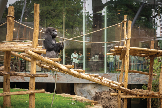 The zoo occupies a large portion of the historical city centre, in close proximity to the central railway station that defines its border to the west. The main entrance to the zoo is on this side, paths leading to a series of facilities that accommodate various animal species. The site for Studio Farris’ project is on the opposite side of the zoo, bordering a mostly residential neighbourhood. Their intervention defines the eastern boundary of the zoo, in continuity with its historical perimeter wall. Its street facade is punctured by openings that reveal some of the inner functions to pedestrians. A series of periscopes allow views into the savannah. On the zoo side, the facade opens up to the main plaza sheltered by a series of square canopies, supported by slender columns that stem from the restaurant’s building and face the historical pavilions, where visitors may enjoy views of the apes’ enclosure on one side and the savannah on the other.