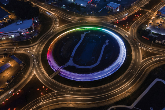 When the design competition was launched three years ago, there was just a large mud-covered empty space which was to be designed and illuminated. The object of illumination was clearly missing, and simply placing regular poles for street lighting purposes was not a satisfactory solution for this project—an architectural structure needed to be invented for the purpose of lighting. It was immediately clear that a traditional approach would not be suitable: placing something in the middle of the roundabout was not an option, a sculpture or an installation would be too big, and they would most likely distract the traffic, or they would be too small and get lost in the roundabout's proportions.