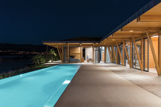 The idea of the Wooden House is fulfilled through strong poetics of wooden construction. The house is designed as an open structure with multiple entrances and exits, as a matrix of different ambiences within the interior and the exterior of the house and transitional spaces in between. The roof of the house is covered with traditional tiles in different sizes and colours. The dimensions of the roof create a deep porch achieved with long beams that define the transitional zone of the house towards the garden and the pool and vice versa.