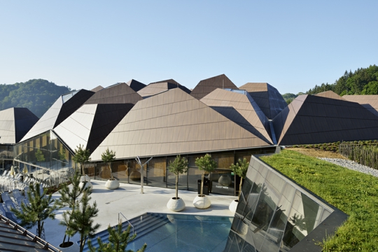 Enota faced a complex challenge in Podčetrtek where the existing architecture was relatively discouraging. The original thermal spa and hospitality complex had been comprised of rather uninteresting facilities, with no articulated relationship with the context and the landscape. In a sequence of separate commissions, in which Enota added to their previous projects of working without an initial master plan, the requirements did not change, but rather grew in scope: more density and more spectacle.