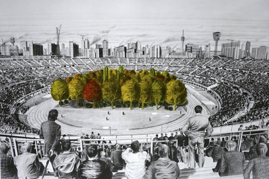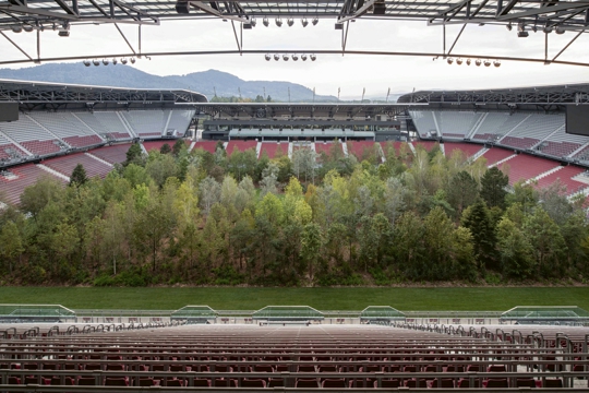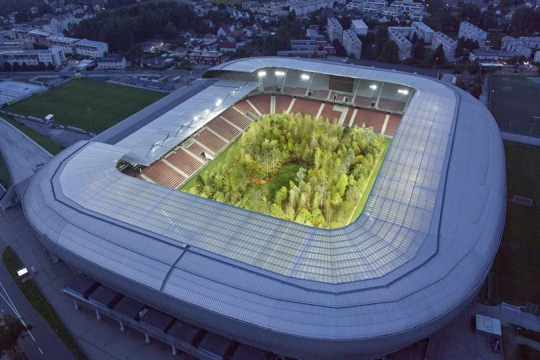 In September this year, we were invited to the opening of the installation titled For Forest – The Unending Attraction of Nature (Die ungebrochene Anziehungskraft der Natur), an artistic project that gives an excellent insight into the mechanisms of the contemporary art scene, especially to those coming from a milieu where the artistic production is primarily dependent on the increasingly more modest state funding, while the high budget projects are reserved for the classics of global art history. The stadium located near Klagenfurt hosted a very specific and technically and logistically ambitious project by Swiss artist Klaus Littmann, made in partnership with many collaborators. Klaus Littmann, a former student of Joseph Beuys, has been producing large public installations within his organization Littmann Culture Projects, with the aim of activating the relation between the public space and the contemporary art sphere. The project is inspired by a drawing of the same title, Die ungebrochene Anziehungskraft der Natur, made in the beginning of the ‘70s by Austrian artist Max Peintner. Littmann uses Peintner’s drawing as a template and translates it literally into another medium. Within the stadium arena he thus erects a forest, and so gives the drawing a physical and sensorial form. In this manner, the stadium with capacity of 30 000 visitors should become a place of reflection and oasis of tranquillity and greenery. The installation was open to visitors from 9 September to 27 October 2019. The entry was free of charge, and the visitors were able to see Littmann’s forest from early morning to late evening in order to experience this hybrid artificial and natural ambience in various conditions.
