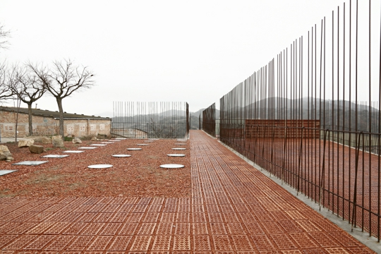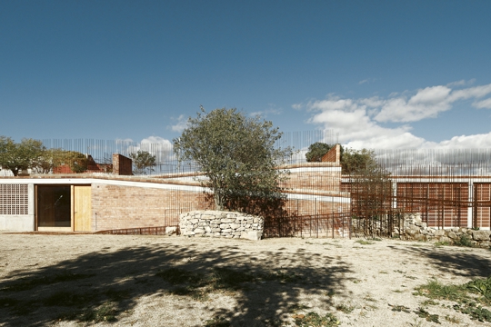 A succession of mild ramps with light and elastic limits made of corrugated steel suggests the transits and covers the different conditions of the designed public space: a clay and humus platform between the square and the pre-Pyrenean horizon, a cliff above the chamber of the steles from which we can localize the area of the discovery, a corner space oriented towards the west with sunlight in the winter and vegetal cover during the summer, some benches made of recycled stones from one of the walls of the orchards, porous paving offering thermic inertia to the roof and embracing the landscape while adapting to the different seasons, the shadows of two recovered warehouses, and the memory of the previous orchards with the spontaneous regrowth of chard. On the inside, the space of the wine offers the product of the local cooperatives and at the same time functions as the village bar. The polyvalent room blends the daily uses, as a social centre with an introduction to the exhibition area where the discovery is documented, and the pieces of the megalithic tomb are displayed.