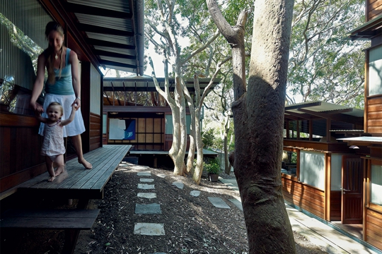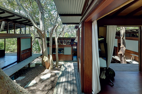 De Selby, the sage in the story – has some interesting things to say on the subject of houses. A row of houses he regards as a row of necessary evils. The softening of the human race he attributes to progressive predilection for interiors and waning in the art of going out and staying there. Elsewhere he defines the house as a ‘large coffin’, a ‘warren’, and a ‘box’. Evidently his main objection was the confinement of a roof and four walls. I was laughing out loud as Flann O’Brien, writing in a gloomy Dublin winter, magically, exactly, uncannily, predicted Jack Ledoux’s architectural approach to life in sub-tropical Sydney.