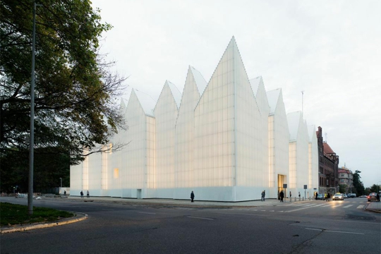 The winning project, the Philharmonic Hall Szczecin, Szczecin, Poland, Barozzi/Veiga (Studio A4 collaborator) is the winning entry of an international open competition for the design of a new complex on the site of the old one. Public expectations charged the program not only with a number of integrated functions – a large hall for symphonic music and a smaller one for chamber music, a grand foyer with upper level exposition spaces – but also with a new symbolic role. The series of pitched gables which crowns the rectangular complex of the new building dialogues well with the silhouette of the nearby Castle.