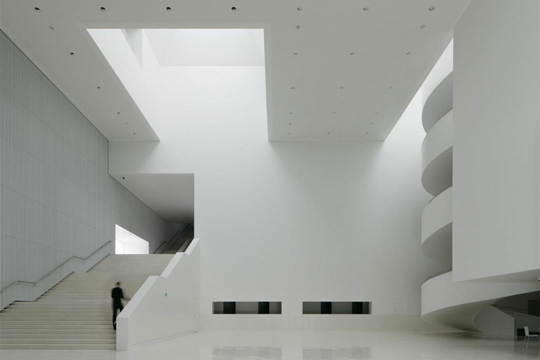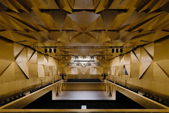 The main symphony hall one is clad by triangular wooden acoustic panels gilded with gold leaf. A large hall with the cafeteria and two grand open stairs take the role of a new covered square in the cold seasons, while multi-functional rooms wrap around the concert halls, offering new chances for cultural and leisure events.