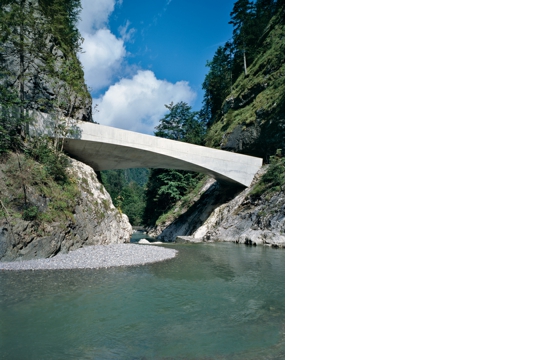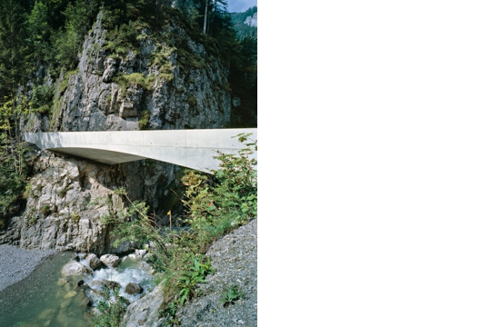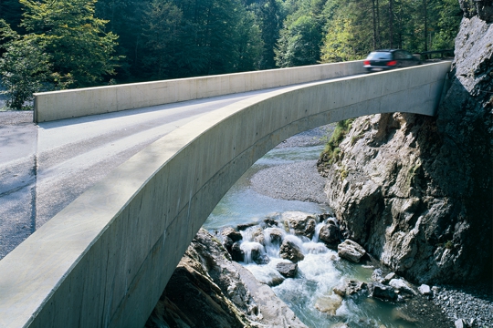 Na koncu je nastalo novo tumačenje masivnoga lučnog mosta, koji svojim oblikom interpretira tijek ceste i doline. Dolazeći iz doline, cesta se probija kroz stjenoviti tunel, a neposredno zatim zakreće udesno i ide ravno preko mosta i rijeke. Raspon mosta iznosi 21 metar, a zbog pomaknutosti obaju bočnih lukova izvija se donja strana mosta s jedne na drugu obalu za oko 50 stupnjeva. Tako nastala geometrija ploče izvedena je iznenađujuće jednostavno, pomoću gipkih ploča oplate na gusto postavljenim, sukcesivno zakrenutim gredama. Dvostrukim savijanjem postignut je visoki stupanj ukrućenosti pa se betonska skulptura logično razapinje između stijena u smjeru ceste. Razmotrimo li presjek mosta, primijetit ćemo elegantno sužavanje prema dolje, što suptilno naglašava temu užljebljenja i raspona između stijena.
