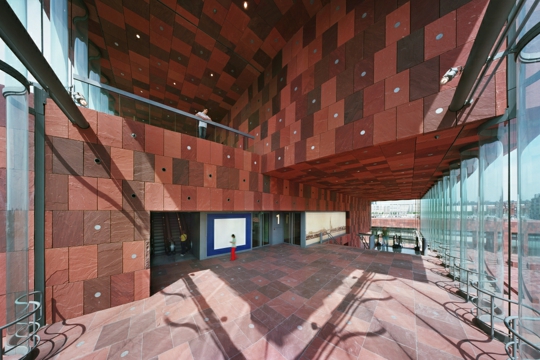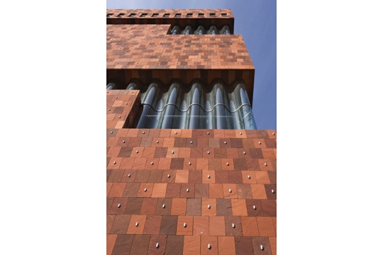 Neutelingsov se muzejski toranj veličanstveno izdiže nad obližnjim vodenim površinama. U pravcu grada je ispred zgrade malko spuštena plaza, koju je umjetnik Luc Tuymans popločio podnim mozaikom s motivom mrtvačke lubanje. Niz od četiri sponzorska paviljona uokviruje put do ulaska u muzej koji se otklonjen od grada, gotovo skriven, nalazi u jednom uvučenom uglu. Pa ipak posjetiteljima neće promaknuti prilaz muzeju – projektu koji bez daljnjega računa s Bilbao-efektom. Postoji li igdje drugdje takav vertikalni bulevar kakav se nalazi u MAS-u, a koji će i izvan radnog vremena biti dostupan? Arhitektura muzeja se također može uspoređivati s Bilbaoom. Kompjutorski generirane ploče od indijskog pješčenjaka iz Agre složene su u kompleksni patchwork ovojnice. Te ploče u četiri nijanse, formata 100x60 centimetara, tvore unatoč svojoj veličini nježni reljef, po kojem je raspoređeno 3185 ornamenata u obliku ruke od aluminija, simbola Antwerpena. Zaigrano je to na flamanski način poput preobilnih svjetova formi i simbola jednog Petera Paula Rubensa, najčuvenijeg umjetnika porijeklom iz Antwerpena.