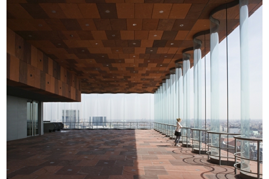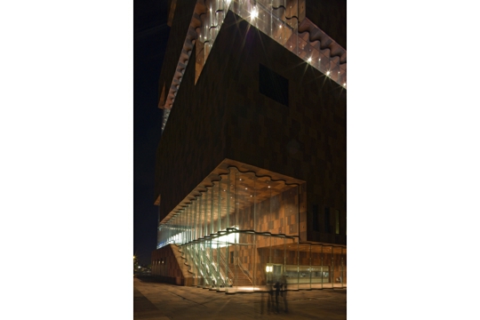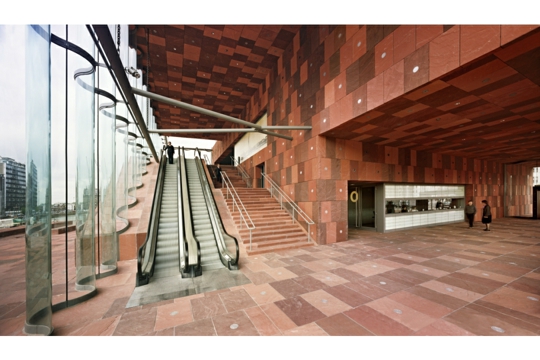 Ploče od pješčenjaka predstavljaju kontrast u odnosu na vertikalne valove staklene opne, koja izvana čini vidljivim kako se zgradom proteže bulevar, a nameću se također asocijacije na vodene kapi. Neutelings i specijalist za staklo Rob Nijsse iz inženjerskog biroa ABT, koji je već u više navrata surađivao s Remom Koolhaasom, zajednički su razvili tu impresivnu staklenu opnu. Njeni standardni elementi imaju dimenzije 5,50 metara visine i 1,80 metara širine koji se na uglovima zgrade, posve bez okvira, slažu jedni do drugih. Međusobno su povezani jedva vidljivim U-profilima, koji imaju debljinu od samo 12 milimetara, no nosivost je osigurana dimenzijom dubine samih valova od 60 centimetara.