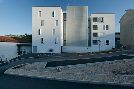 ..U ovom projektu kao prvi dijalog s gradom shvaćam logični nastavak kule kao repera ili oblikovnog elementa višestambene građevine. Urbanistički prateći smjer glavne ceste, a time nastavljajući kolajnu visoke gradnje u niskom okruženju, interpretiraju visinsku razliku zatečenog stanja kao postament. Građevina se sastoji od tri stambena kubusa povezana proširenom komunikacijom sa stubištem i dizalom (to je prvo stambeno dizalo u Vrgorcu). Krajevi hodnika ili unutarnjih “kala“ osvijetljeni su prirodnim svjetlom, koje preko stubišta daje ovim prostorima svjetlosnu geometriju...