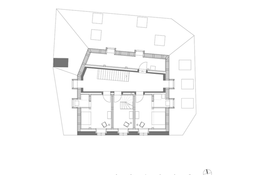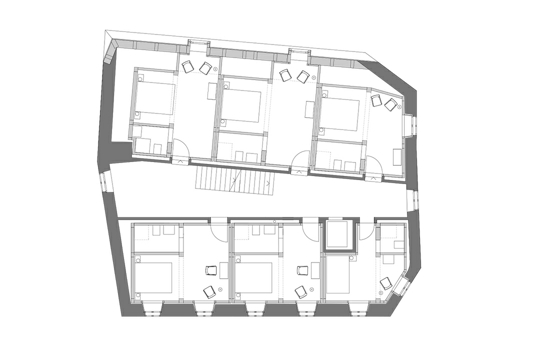 Od prvog kata ostala je samo stara kamena fasada, a s njom i nekoliko povijesnih prozora s okovima. Kao rezultat rušenja, radikalnih promjena i novog u Altes Hospizu nastalo je 14 udobnih novih gostinskih soba, sve ugodno mirišu po svježem drvetu, a lijepe su na arhaičan i jednostavan način: dvije stolice, jednostavna drvena komoda, niše s krevetom te impresivna planinska panorama. Kupaonice gostinskih soba imaju tamni, lagano sedefasto svjetlucajući namaz kao zaštitu od vlage. Krunu kuće čini dvoetažni prostor ispod krova s velikim prozorom i slobodnim pogledom na planine.
