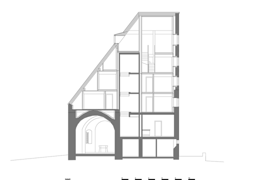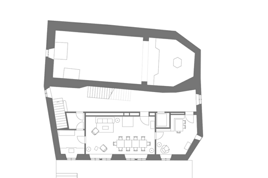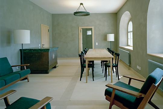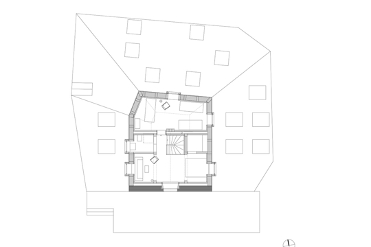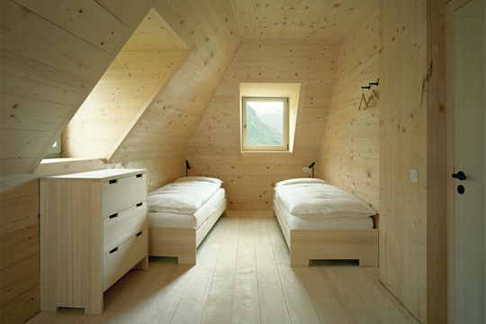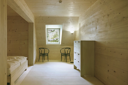 Različiti su vremenski slojevi, nataloženi brojnim pregradnjama konačišta u prošlosti, vidljivi pažljivom promatraču, ali su istodobno nenametljivite tvore smislenu građevnu cjelinu: stara drvena ulazna vrata, kamene stube, ali i spojeni lukovi prozora na prvom katu. Potječu iz faze obnove nakon 1905. i pridonose karakteru južne fasade. Iza njih se nalazi prostrana zajednička prostorija, sa starim kaminom i novom tamnom vapnenom žbukom, na koju se nastavlja nova kuhinja. Pravi je užitak prati posuđe u sudoperu od crnog betona, a zbog vidika koji se pruža čovjeku zastaje dah. Inače u unutrašnjosti dominira novo – Miller & Maranta su staroj kamenoj zgradi dali prefabricirani unutarnji život od drveta. Drvena konstrukcija očarava obrtničkom preciznošću. Arhitekti se tako pozivaju na tradiciju građenja drvetom, poznatu u kantonu Uri već od 15. stoljeća.