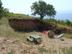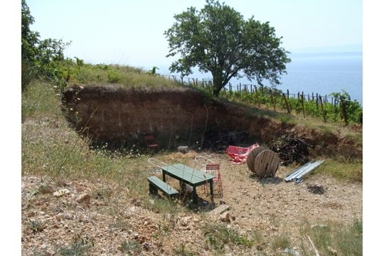 Nasred kosine brda zasađenog vinogradima slučajno sam otkrio ovaj iskop za nerealiziranu građevinu. Taj neočekivani (skoro lendartistički) prostorni fragment inspirirao je poljodjelce da ga posvoje – donijevši stol, klupu i stolicu učinili su ga mjestom svojega težačkog odmora. Vjerojatno im je, kao meni u kamenolomu, bio potreban odjek ljudskog djelovanja da bi se tu osjetili doma. Mene su pak ponukali da na tren zastanem, prepustim privremenom zaboravu svoj cilj i poput njih se odmorim.