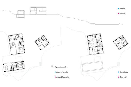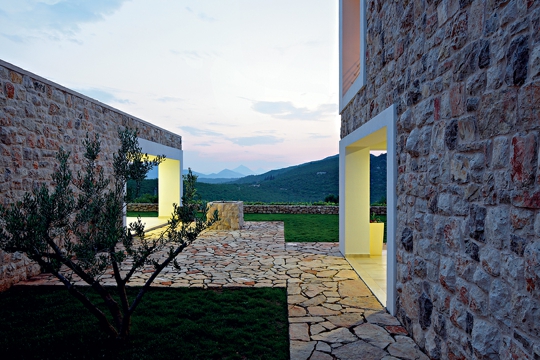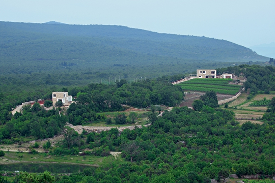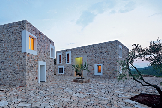 Projekt obiteljskog imanja bio je arhitektima Ćurković-Zidarić u potpunosti novi izazov. Građevine nisu vezane ni uz kakav katastar (ili nije primaran), nema odredbi o urbanim pravilima, nisu traženi visokosofisticirani materijali i detalji pri izvedbi. Pristup projektnom zadatku suočavan je s tlom, vegetacijom, hladovinom, pogledom i kao najvažnije – umijećem lokalnog majstora. Nakon te spoznaje jasno nam je da je za parterno popločenje i pročelje korišten isti i jednako obrađen kamen iz lokalnog kamenoloma, vežući se tako s kamenom ‘in situ’ koji nalazimo u starom i novom suhozidu. Tu vrstu vapnenastog kamena nalazimo na cijelom imanju. Grupiranjem građevina na vrhu brda (vlasnikova kuća, gostinska kuća i gospodarska građevina) preslikava se memorija mjesta hercegovačkih sela gdje su sva sela grupirana po zaseocima kao svojevrsni nukleusi života. Često se zaseoci nazivaju po prezimenima stanovnika. Razlika je samo u tome što su svi ti zaseoci formirani pod brdom, uz prisoje ili osoje, put ili rijeku. Uza sve ono što je donosilo život. Rijetko su ti nukleusi formirani na vrhovima. Vrhovi su ostavljani za fortifikacije, što pokazuje burna povijest tih graničnih predjela, te kapelice i groblja uokvireni čempresima kao simbolom težnje prema nebu. Zato ovo imanje ima elemente fortifikacija i oblikovne imitacije zaseoka, te komunicira s kampanelima, preslicama i čempresima lokalnih nekropolisa. Sami kubusi građevina svojom opnom od lokalnog kamena i bijelim okvirima interpretiraju lokalnu građevinsku tradiciju, no svojim proporcijama i omjerima ujedno je karikiraju. Projekt koristi i karikira tradiciju koliko mu to dozvoljava autorska gesta. Jako važna komponenta ovih građevina osim njihove opne je odnos natkrivenih, nenatkrivenih i zatvorenih prostora, koji su po logici hlada i putanji Sunca stvarani, dubljeni ili izbacivani. Zato stvoreni međuprostori ovih građevina pod snažnim sjenama zalazećeg Sunca na solidu kamenih zidova u meni bude sliku De Chiricove perspektive. Možda nadrealne komponente i služe da bismo bolje razumjeli našu realnost.