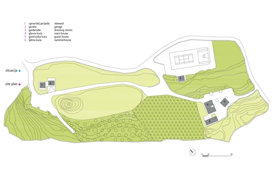 Obiteljsko imanje se prostire na približno 35 000 četvornih metara. Zamišljeno je da funkcionira samostalno i neovisno o uzgoju poljoprivrednih proizvoda i ostalih prehrambenih namirnica, gdje sama arhitektura nastoji biti integralni dio ovog koncepta. Program ujedinjuje: kuću za vlasnika, gostinsku kuću, gospodarske građevine, domarovu kuću, prostor za meditaciju, sportske i rekreacijske terene s popratnom građevinom, voćnjak, povrtnjak, vinograd (nasadi caberneta, shiraza i plavca), maslinik, nasade ljekovitog bilja, autohtono raslinje. Svi ti sadržaji obgrljeni su kolajnom od suhozida.