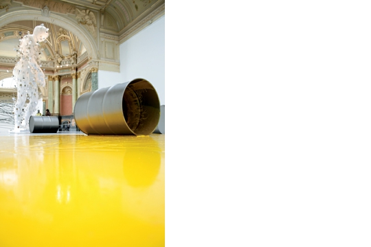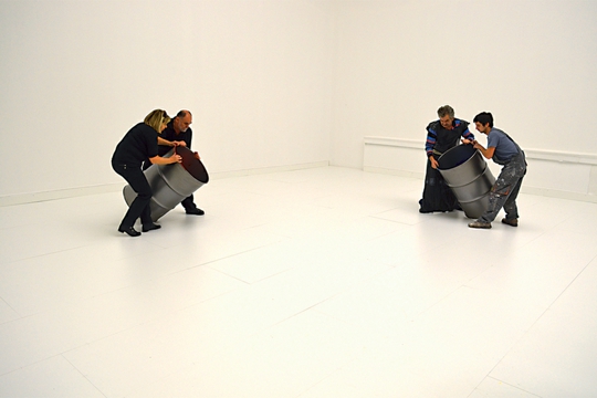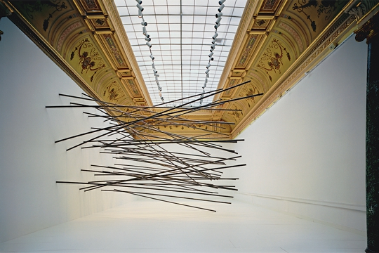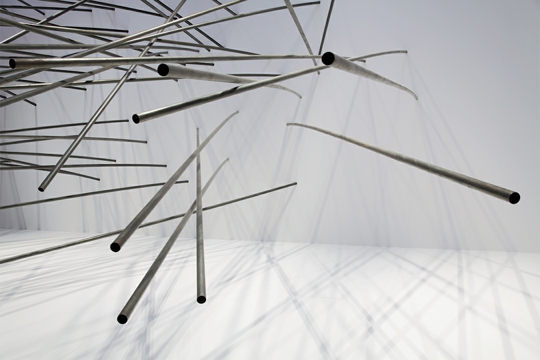 Slično poigravanje prostorom je i u perceptivno najsloženijoj instalaciji Ovalna skulptura – iz rupa na zidu Paviljona (raspored kojih podsjeća na Fontanine Ovalne slike, pa odatle naslov, iako se taj dojam gubi u radu) izlaze velike cijevi. U nepravilnom rasporedu one osvajaju, u potpunosti ispunjavaju i prostor krila Paviljona i vizualno polje promatrača, zadivljuju neobičnom artikulacijom prostora koja je planirana, promišljena, ali i neuhvatljiva. Izazvani da šećemo kraj skulpture, pomalo nas provocira nepravilnost postava prečki, a ne možemo se oteti dojmu isplaniranosti svega. Lucio Fontana je derao platna ‘produbljujući’ na sebi svojstven način ono što se zvalo ‘prostor slike’ (nasuprot paru tog pojma ‘slikanom prostoru’ koji se odnosi na iluzionirani prikaz dubine na slici). Rašić ispunjava sam prostor osmišljenim ‘silnicama’ koje ga dinamiziraju, vrlo odmjereno i neagresivno, unatoč njihovim naizgled nepravilnim smjerovima pružanja. Svako toliko jedna prečka padne i podigne se elektromotorom, kao dodatak ideji ‘metode u ludilu’ (rekao bi Shakespeare).