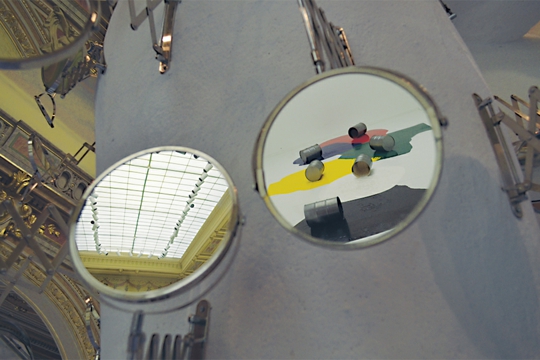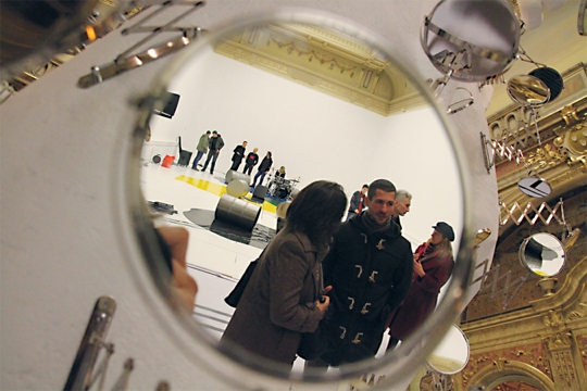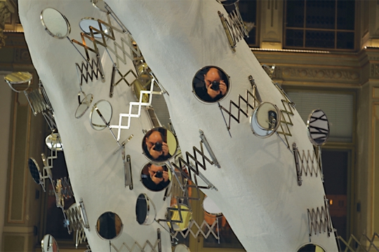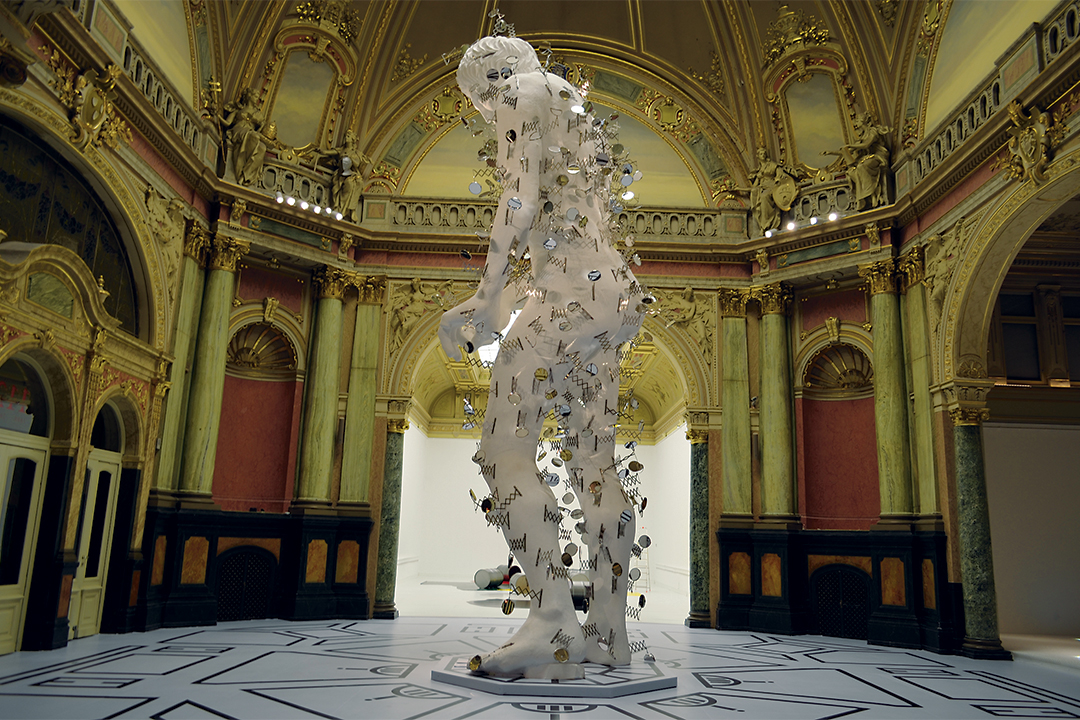 Uvećanje lošinjskog Apoksiomena na devet i pol metara te njegovo prekrivanje ogledalima autor naziva Historicistički kabinet čuda, aludirajući na izložbeni prostor Paviljona kao i drevne kabinete čuda, preteče različitih muzeja. Pogledi koji se zrcale sa skulpture pokazuju ono čemu Rašić teži – igru više mogućih točaka gledišta, percepcije, vizualnog. Uvećana antička skulptura sugerira mjeru i drevni ideal ljepote. Kako su svi antički kipovi rađeni da bi djelovali skladno, po mjeri koja je proistekla iz ljudskih evolutivno stečenih proporcija (pa se zato u vezi antike često citira veliki sofist Protagora da je ‘čovjek mjera svih stvari’), umjetnik pokušava i u ovom predimenzioniranom kipu sadržati ideju mjere koja je nama ugodna: to je mjera u kojoj je napravljen i Paviljon (i svaka druga arhitektura) pa postavljanjem goleme antičke skulpture u njega umjetnik povezuje klasične težnje s onima historicista, nasuprot mnogima koji (još danas) taj arhitektonski stil optužuju za lažnu monumentalnost i pompoznost. Veličina se, ponavljamo, ne može uzimati po sebi kao pozitivna ili negativna osobina. Ovaj rad podrazumijeva i interakciju posjetitelja, kao i ostali izloženi radovi: šećući oko skulpture, možemo vidjeti odraze koji se mijenjaju, odbljeske svjetla na njoj (ovisno o dobu dana), a pod njom je istaknut otisak koji ponavlja zrakastu strukturu podnih inkrustacija Paviljona s istaknutim debelim crnim konturama oblika na bijeloj podlozi. Preuzimanje i pojednostavljivanje prostora koji sudjeluje u recepciji umjetničkog djela u njemu čine ovu instalaciju postmodernističkom igrom s tradicijom i elementima forme, gotovo manirističkom invencijom.