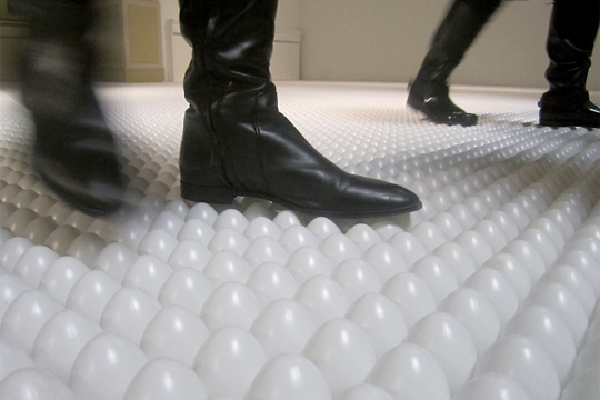 Skulpture ili instalacije na ovoj izložbi djeluju na naš estetski osjećaj na više načina. Instalacija Ja-ja prikazuje tlo prekriveno jajima. Uz igru riječima (ja, osobna zamjenica u prvom licu jednine, na engleski je lijepo prevedena kao Eggo), rad je i igra percepcijom. Posjetitelj je pozvan da hoda po jajima (u igri riječima, da hoda po svome ‘ja’) i kako ona možda ne izgledaju kao prava, ali su jednako krhka, u trenutku kada stanemo na njih, ne možemo se oduprijeti dojmu da će puknuti. Polje jaja pod nama na mjestima djelomično svjetluca, a kada bi se upalila sva svjetla, iščitali bismo riječ ‘love’ preko cijele površine, što sugerira nastajanje i nestajanje, stvaranje kojega su simbol i jaja (prirodni inkubatori) i sama ljubav iz koje nastaju različita kvalitetna (umjetnička ili druga) djela. Igra očekivanjima (slična kao i u Noćnoj mori istog autora) osmišljava vizualno i osjetilno našu reakciju. Vilayanur Subramanian Ramachandran, neuroznanstvenik koji u svom radu pokušava pronaći neke zakonitosti koje upravljaju estetskom reakcijom našeg mozga u članku The Science of Art iz 1999. godine, navodi neka pravila među kojima možemo čitati mnoge tendencije pokazane u Rašićevu stvaralaštvu – spomenuta igra percepcijom, ugodno djelovanje kontrasta, traženje jedinstvene točke gledišta, ali i izmicanje istoj točki kao svojevrsna ‘neuhvatljivost’ i nesagledivost prostora (kakva se apostrofira umnožavanjem istih oblika na ovoj instalaciji ili još izraženije na Ovalnoj skulpturi), ravnoteža, proporcije pa i metaforička priroda umjetnosti (igra riječima u nazivu ovog djela, recimo). Sve te ‘zakonitosti’ primjenjive su i na rad Ja–ja, kao i na druge izloške. Ono što Ramachandran postulira jest mogućnost definicije lijepoga na temelju prirodoznanstvenih istraživanja. Umjetnost je lijepa nudi isto u praksi – ona ne govori o lijepome, nego ga izravno pokazuje s obzirom na učinak umjetnosti na naš mozak. Estetsko iskustvo je posebna reakcija mozga koja se nipošto ne dobiva razmišljajući o društvenim problemima ‘ovog mjesta i vremena’, kako želi pokazati mnoga suvremena teorija umjetnosti, parajući naše uši kvaziangažmanom i pseudofilozofijom. Umjetnost je naprosto lijepa, bez obzira na takve stavove i zapravo lošu umjetnost koja hoće reći suprotno.
