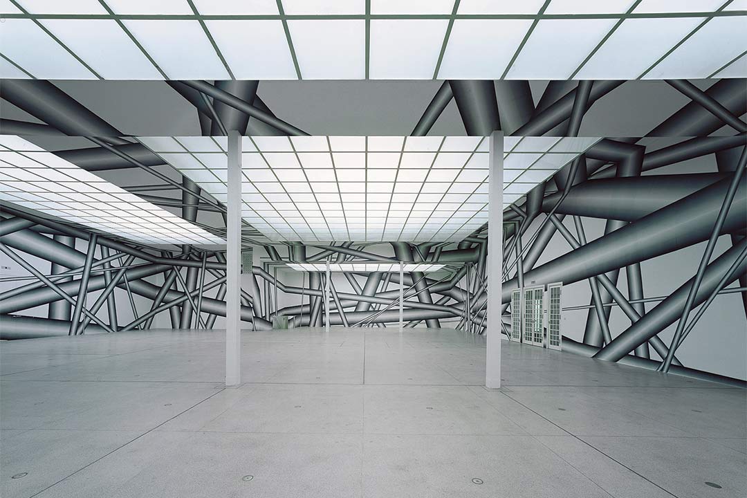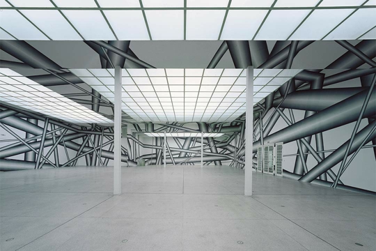Kogler: Ima i jednog i drugog, pa i kad se djeluje protiv prostora, pretpostavka je razumijevanje njegove strukture. S time u vezi, spomenuo bih svoj projekt za Bečku secesiju (Wiener Sezession), koja je zapravo bila prvi White Cube. Zgrada je iz kasnog 19. stoljeća, ali je prototip modernog izložbenog prostora. Tada sam radio instalacije ortogonalne strukture; sastojale su se od horizontala i vertikala. Prostor Secesije je ortogonalan, sve što sam na modelu napravio, bilo je primjereno stvarnom prostoru. Na osnovi toga sam se odlučio za suprotan princip: odustati od ortogonalnog. Razvio sam projekt koji sa stvarnim prostorom stupa u dijalog. Nastao je prostor slike, definiran tankim, tek prilijepljenim slojem papira, tapetom, posterom, u odnosu prema prisutnom prostoru.