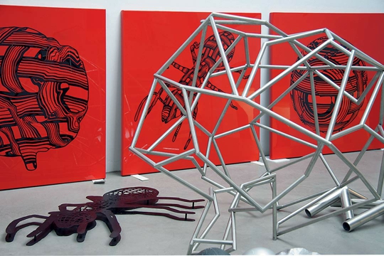 Podrecca: Upravo ta poetika demarkacijske linije određuje objekte koji su konstruirani i izloženi bez miljea; tu nema žubora potoka, nema dodatnih sastojaka, djelo nema paspartua. Objekti su to što jesu: konstruirani objekti, žarulja, mrav… To su pojedinačni elementi u kojima su pojmovi umjetnost i znanost amalgamirani. Postoje li u Vašem radu paralelni elementi – prednji plan, pozadina, glavna tema, sporedna tema, ima li tih sekvenci slojeva u Vašem djelu ili su to uvijek sasvim jasni motivi, posve jasni ideogrami kako ih ja poznajem?