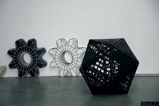 Podrecca: Znači, iako ga projekt razbija, polazi od pozicije stvarnog prostora. Temu pri oblikovanju prostora predstavljaju također ljuska i jezgra. S jedne strane, tu je barokni princip, začudnost, povećanje, produbljivanje prostora, mogli bismo kazati muskulatura prostora. S druge strane, radite i uporabne predmete, nešto između umjetničkog djela i objekta. Tu je prisutan taj princip ljuske i jezgre. Kod instalacija postavljate promatrača u centar akcije gdje postoji mogućnost sudjelovanja, također haptički; razvija se osjećaj da se želi odgurnuti cijev koja pada. Provocirate tu želju da se stvari dodirnu, participaciju, a istovremeno pravite paspartue za predmete. Dakle, uvijek postoji zona napetosti između profanog i dostojanstvenog, baroknog. To nije svakodnevna pojava, to me u Vašem radu zanima. Kada ste počeli oblikovati temu ljuske i jezgre?