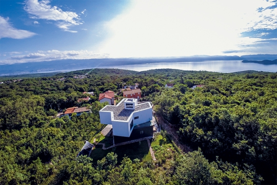 Sam program rezultat je očekivanja četveročlane obitelji što bi njihova kuća za odmor trebala sadržavati. Željeli su konobu, otvoreni zajednički dnevni prostor, bazen, terasu i dovoljno privatnosti za svakog člana obitelji. I sve je tu – jedan, dva, tri, četiri. Kamenom obložena čvrsta baza, na njoj aluminijsko-stakleni kvadar, terasa i bazen na betonskom nosaču te na vrhu četiri žbukane, zasebne kućice. Kamen, beton, staklo, žbuka – poput nekakve arhitektonske mantre. No, i ovdje, baš ovdje, cjelina je veća od zbroja svojih dijelova.