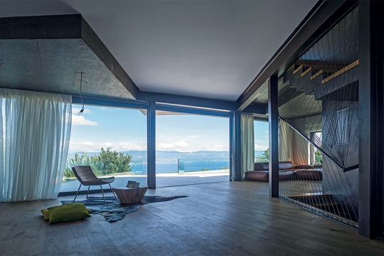 Sama materijalizacija kuće natjerat će i najveće skeptike prema golom betonu da se bace na razmišljanje. Taj beton, nehajno bojan toplom (da!) crnom i crvenom bojom, savršeno se nadopunjuje s čeličnim gredama neobrađene površine, drvenim podovima (koje olakšanje nakon keramičkih pločica, valjda najbitnijeg detalja svih apartmana na moru), ogradama isprepletenim od čeličnih sajli. Kuća je vrlo taktilna, poziva vas da je dodirnete, da je ispitujete svim osjetilima – čak i sluhom. Kada prolazite kraj bazenske tehnike, ona nekako, tko bi rekao, romantično žubori.
