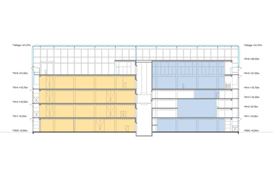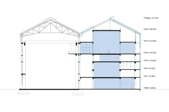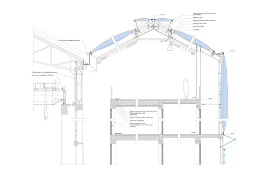 Nova dvorana ne bliješti luksuzom: sirovi beton, minimalne finalne obrade, tehnička pomagala namjerno ostavljena vidljivima. Prefabricirana betonska konstrukcija podignuta uz staru dvoranu određuje slobodne, fleksibilne razine, prilagođene potrebama sadržaja. Na svakoj razini u stražnjem dijelu nalazi se prostor za skladište, u prednjem prostorije za izložbe. Lagana vanjska ovojnica sastoji se od Lexan ploča, u gornjem dijelu kompletirana termoplastičnim panelima u čeličnom okviru, koje arhitekti ovdje po prvi put koriste. Kao u svim projektima Lacaton i Vassala, u interijeru Frac du Nord-Pas de Calais razlikuju se dva tipa prostora. S jedne strane, nailazimo na savršeno izolirane prostorije – bilo ostakljenjima (ulaz, prostorije za izložbe…), bilo sandwich panelima korištenim za negrijane prostore; s druge strane, na prostore jednostavno zaštićene vanjskom ovojnicom – vertikalne komunikacije, međuprostorne galerije između dvorana i fasade i svakako veliki gornji volumen. Korištenje termoplastičnih panela na čeličnom okviru, na krovnim kosinama i fasadi, ovdje omogućuje bolju izolaciju od one dobivene jednostavnim Lexan pločama. Kao u stakleniku, zaštitu od sunca pružaju pomična horizontalna platna.