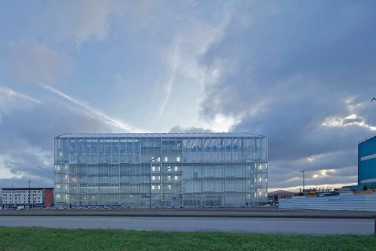 Prvi je kontakt s Nord-Pas de Calais zbunjujući. Dvije dvorane više impresioniraju svojom veličinom nego izvedbom; jedna u masivnom betonu, druga obavijena laganom transparentnom ovojnicom. Da nema sibilske rečenice i crvenih neonskih slova na pročelju jedne od dvorana, teško bismo povjerovali da se nalazimo ispred značajnog kulturnog kompleksa. Tražimo čak i ulaz koji se stapa s Lexan pločama fasade.