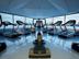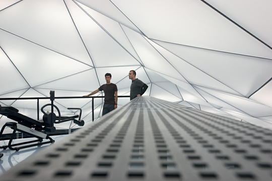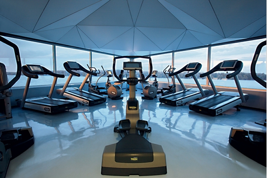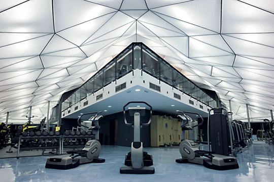 Između stropa i spuštenog stropa postavljena je rasvjeta kojom se, kao na sceni, mijenja atmosfera ovisno o dobu dana i meteorološkim uvjetima. Noću strop, pa i sam prostor djeluju prozračno, nejasnih rubova, lebdeće i gotovo nestvarno. Staklena traka pod umjetnim svjetlom postaje zrcalo, a gledano izvana podsjeća na zelenkastim svjetlom obliven svemirski brod. Danju prostor izgleda mnogo čvršće, dnevno svjetlo mijenja atmosferu ovisno o meteorološkim prilikama. Sprave za vježbanje samo potenciraju nadrealni dojam. Prateće prostorije - svlačionice, administracija i prijemni pult - projektirane su krajnje jednostavno i elegantno. Sve je podređeno velikom prostoru. Vježba se tijelo, a pogledom na ušće Save u Dunav opušta duh. Ako je vrijeme lijepo, vidi se Zemun i dio Novog Beograda.