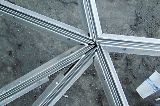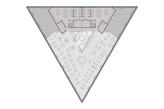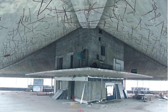 Velika prostorija u kojoj je bio restoran oljuštena je do konstrukcije. Tako je izronila galerija odličnih proporcija, do tada skrivena sustavom za ventilaciju. Ostao je beton poda i tavanice te neprekinuta staklena horizontala prozora i golo spiralno stepenište s otiscima drvenih talpi u betonu. ‘Antić je projektirao u rasteru jednakostraničnih trokuta sa stranicom 7,3 m, što se odražava u organizacijskoj i konstruktivnoj logici prostora. Nova namjena prostora tražila je stvaranje novog prostornog izraza. Odlučili smo da to bude strop, odnosno spušteni strop od čelične trokutaste konstrukcije. Dobili smo 390 panela koji su po obliku i veličini pripadali ograničenom i kontroliranom setu prostornih varijacija.’