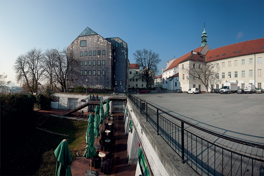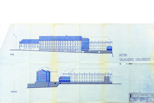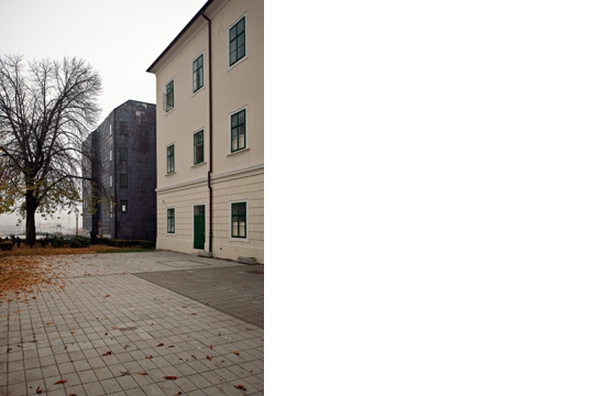 Gornji plato vanjskog dvorišta u sjeveroistočnom i jugozapadnom uglu blago je zakrilio novim građevinama, tek toliko da se vizualno dobije intimniji prostor. Manja zgrada uz sjeveroistočni ugao vanjskog dvorišta tek je masom asocirala na nekadašnji prigrađeni objekt, o kojem je bilo tek malo podataka. Veća je predviđena za upravu i druge muzejske službe. ‘Zbog kompleksnosti cjelokupne muzejske strukture i ograničenja postojeće zgrade, donijeta je odluka da se uz zgradu gimnazije, u neposrednoj blizini samostana, sagradi upravna zgrada muzeja, u koju je trebalo staviti one sadržaje koji zbog svog kapaciteta i sadržaja nisu mogli stati u postojeći volumen bivšeg samostana, unatoč povećanjima (ulazno krilo, dio pod zemljom, i u potkrovlju).’ [16] Naime, donator je s vremenom povećavao svoju donaciju pa je pomanjkanje prostora postajalo sve veći problem, zbog čega je odustao od izlaganja zbirke u nekadašnjemu jezuitskom samostanu, ali izložbeni su prostori tada već bili pred samim završetkom.