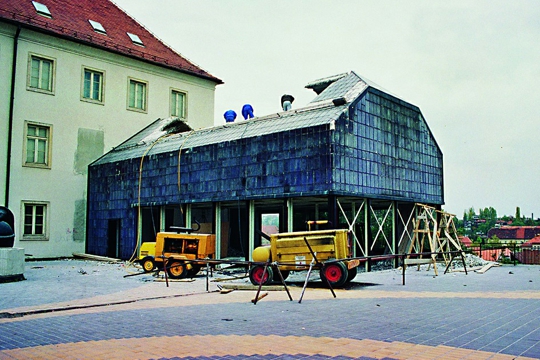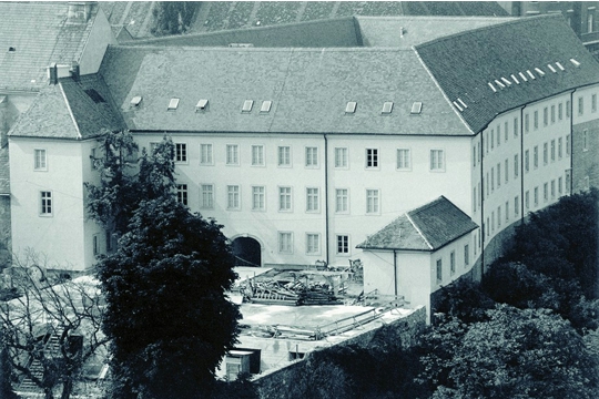 Kompleks nekadašnjega isusovačkog samostana, prije radova na adaptaciji, imao je uredsku namjenu, a jedno je vrijeme u njemu bila smještena, nažalost kratkog vijeka, Akademija za primijenjenu umjetnost. Tako su, na primjer, u jednoj trošnoj prizemnoj zgradici ispred južnog pročelja kompleksa, usred povrtnjaka, studenti imali kiparsku radionicu. Naime, tlo najvećeg dijela sadašnjega južnog dvorišta bilo je prekriveno povrtnjacima. Na samom jugoistočnom uglu, nad rubom gradskoga obrambenog zida u ljetno su se vrijeme uzdizali i kolci s mahunama bažula.