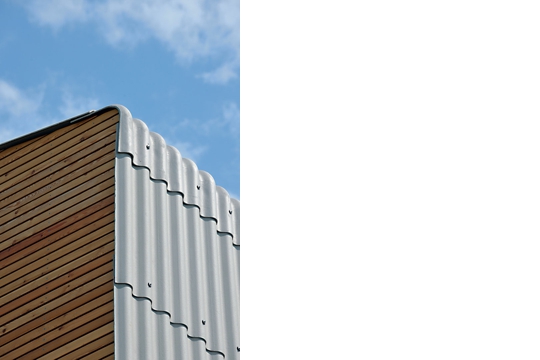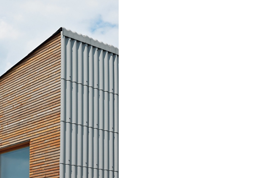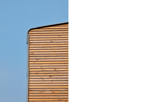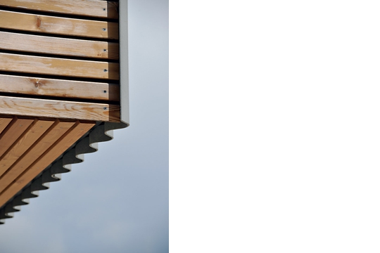 Tako na rub postavljena kompozicija od triju po osi težišta međusobno povezanih etaža, ostvaruje u napetosti vlastite konstrukcije nevjerojatnu mirnoću. Poput tihe ravnoteže majstora joge koji u naizgled neudobnom položaju žmireći satima stoji na jednoj nozi. Obje istake korpusa kuće istodobno su dobro promišljene nadstrešnice. Poput klina zašiljen krov na jednu vodu, kompozicija prozora i tekstura fasade usuglašeno uravnotežuju gravitacijsku točku stabilnosti objekta. Čini se kao da bi lagani udar vjetra tu dječju igračku mogao prevrnuti preko oštrog ruba. Fasada se sastoji od vodoravno montiranih letvi od ariša po uzdužnoj i unutarnjoj jezgri građevnog korpusa te od valovitih, uzdužno položenih vlaknocementnih krovnih ploča po izloženoj vanjskoj fasadi. Ulaz u kuću i prozori glavnih stambenih prostorija disciplinirano su, dosljedno i prema pravilu formirani po površinama drvenih fasada. Dnevni boravak je postao dvokatnim središtem kuće sa prepoznatljivim zastakljenjem ‒ prema jugu da bi se postigla kvalitetna osunčanost, a prema sjeveru kako bi se osigurale najljepše vedute netaknutih poljana.