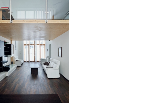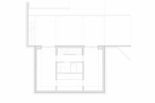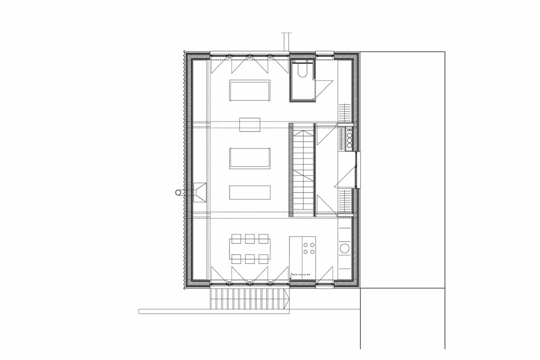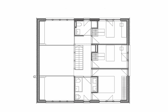 Raspored i orijentacija unutarnjih prostorija također nisu prepušteni slučaju. U strogo odmjerenim, statički optimiranim gabaritima organizacija prostorija nanizana je uz stubišnu instalacijsku jezgru, zajedničku za sve tri etaže, koja predstavlja gravitacijsko, komunikacijsko i servisno težište objekta. Dnevni boravak, kao centralni prostor obiteljskih susreta, preko poprečno postavljene galerije diskretno je vezan za mansardnu spavaću etažu. Prostorije spavaonice i dviju dječjih soba cjelovito nadopunjuju organizaciju središnje jezgre sa roditeljskom i manjom, dječjom kupaonicom na krajnjim točkama hodnika koji se nastavlja u višenamjenski galerijski prostor. Podrum sa priručnom radionicom i ostavom omogućuje i aktivnosti slobodnog vremena i društvene aktivnosti sa neposrednim pristupom na natkriveno dvorište, zaklonjeno od pogleda susjeda. Ukratko, nadasve uporabivo rješenje.