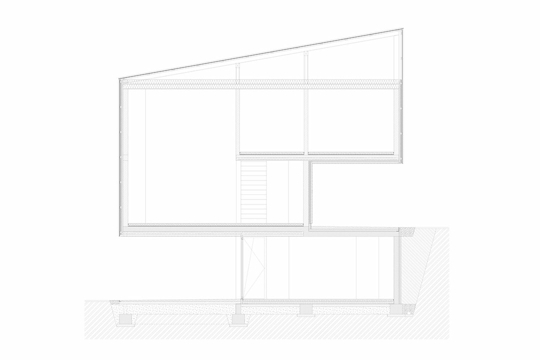 Slične osjećaje kao Petit pri planiranju svojih odvažnih podviga zacijelo su imali arhitekti kada su proučavali raspoloživo zemljište za doduše posve uobičajenu narudžbu obiteljske kuće u predgrađu Škofje Loke. Lako nagnuti teren bilo bi upravo šteta izravnati i na njemu stvoriti idealnu ravninu za jednu od mnogobrojnih tako karakterističnih kuća s krovom na dvije vode uz rub naselja. Arhitekti su, promišljajući naručiteljeve zahtjeve o organizaciji kuće kao i datosti lokacije, odabrali svoj pristup s istančanim osjećajem za potpunim iskorištenjem karakteristika zatečenog reljefa. Uz nagib su postavili betonski zid, time su formirali dvorište, na rub zida postavili su kuću koja konzolno lebdi nad dvorištem i nad ostatkom terena. Sve je to vrlo daleko od ustaljenih pogleda na građenje. Kao da je kuća sastavljena od lego kocki, a dječja ih ruka izazovno gura prema rubu stola.