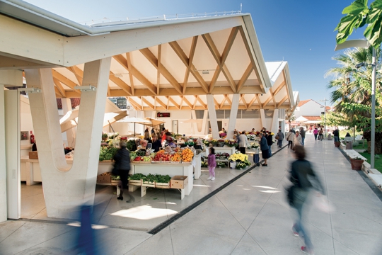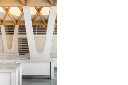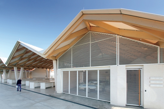 Projektom je kontekst uzet u obzir i na razini samog arhitektonskog oblikovanja, upravo koliko je bilo potrebno da posve nova prostorna vrijednost uspostavi jezik stabilnosti sa zatečenim stanjem. Nadstrešnica, kao najprisutniji element kompozicije, preuzima osnove geometrije i ritma krovnih ploha trgovačkog centra uz koji se prislanja, i tako zatvara urbani blok. Bijelu hi-tech samoperivu pokrovnu membranu nosi robotski rezana lamelirana drvena romboidna struktura. Ta je profinjena struktura proizašla iz logike konstrukcije i nametnula se kao jedna od nekoliko posve čistih i nosivih tema projekta. Tako formalnu konzistentnost tržnice s ribarnicom i dijelom pješačke ulice obuhvaćene projektom čini upravo repliciranje tog istog rastera na podnoj plohi od brušenog betona (koja je ujedno i temeljna ploča u koju su ugrađene instalacije), kao i sukladan oblik armiranobetonskih stupova. Uz nadstrešnicu, stupove i pod, četvrti osnovni element ove prostorne kompozicije su reutilizirani postojeći kameni prodajni stolovi. Obnovljeni su i izbrušeni tako da njihova glatka tekstura predstavlja narednu nijansu ugodne bjeline različitih materijala u ovom prostoru bez boja i detalja. Detalje pak čini pomno odabrana pokretna oprema prodajnih mjesta: suncobrani, vage, kase, sjedalice... i dakako, obilje voća, povrća i plodova mora koji zapravo zajedno s korisnicima aktiviraju prostor. Drugim riječima, ono što je omogućilo pragmatičnost kakvu je zahtijevalo ispunjenje potreba zajednice u ograničavajućim okolnostima i s ograničenim sredstvima, a ujedno i neporecivu arhitektonsku poetiku, je temeljenje projekta na ekspresiji univerzalnim arhitektonskim vrijednostima: skladnim mjerilom kao i promišljenim i jasnim prostornim i ravninskim odnosima, oblicima i ritmom, te odabirom materijala, tehnologije građenja i vrste konstrukcije.