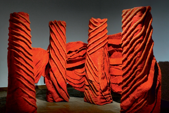 Jagoda Buić — Ona i ja smo počele zajedno, to su oni sretni trenutci kad se inovatori nađu kao prijatelji uz čašu vina i vjeruju u svoje ideale. Tu je bila i grupa Čeha; naravno da je među Poljacima najistaknutija bila Magdalena Abakanowicz s kojom sam u nekoliko navrata i izlagala. To su oni zlatni veseli počeci puni entuzijazma. To se u svijetu zvalo Slavenski val, a na vrhu njega bile smo Magdalena i ja, koje smo poslije svaka krenule svojim individualnim putem, ali smo se u istom trenutku zaista našle na čelu avangarde i to je urodilo lijepim prijateljstvom. Ona je apsolutno dostojna svoje poljske nacije koja je iza nje stajala u punom smislu te riječi, što se ne bi moglo reći za mene. Kako Francuzi nisu htjeli izgubiti svoj prestiž u modermoj tapiseriji – makar se i ne slagali – dali su mi mogućnost da imam svoj atelje, svoju školu za mlade studente, da izlažem u francuskim muzejima, a počelo je to s Muzejom grada Pariza 1975. godine. Tada sam prvi put izložila svoje ambijentalne kompozicije. Iza sebe sam imala dosta dugo iskustvo scenografije na otvorenim prostorima pa sam kreirala taj novi prostorni koncept kojem sam težila.