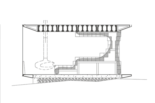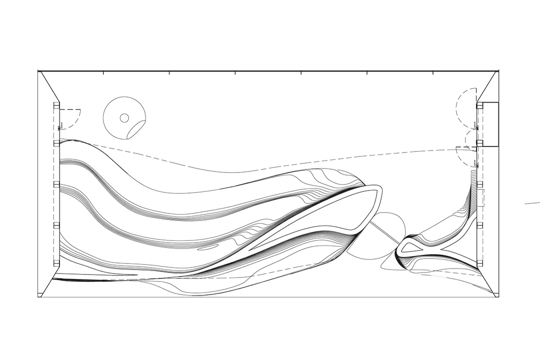 Kontrast između mehanički konstruiranoga čeličnog okvira i ručno izrađenog interijera još je jedan važan aspekt. Interijer je izrađen kao cjelina; izražajnog je i organskog oblika, poput vala u pokretu, smrznutog u trenutku kad je udario u neočekivan čelični okvir. A protiv zimskih oluja pomaže kamin koji visi sa stropa na unutarnjem kraju prostorije kao samostalna skulptura.